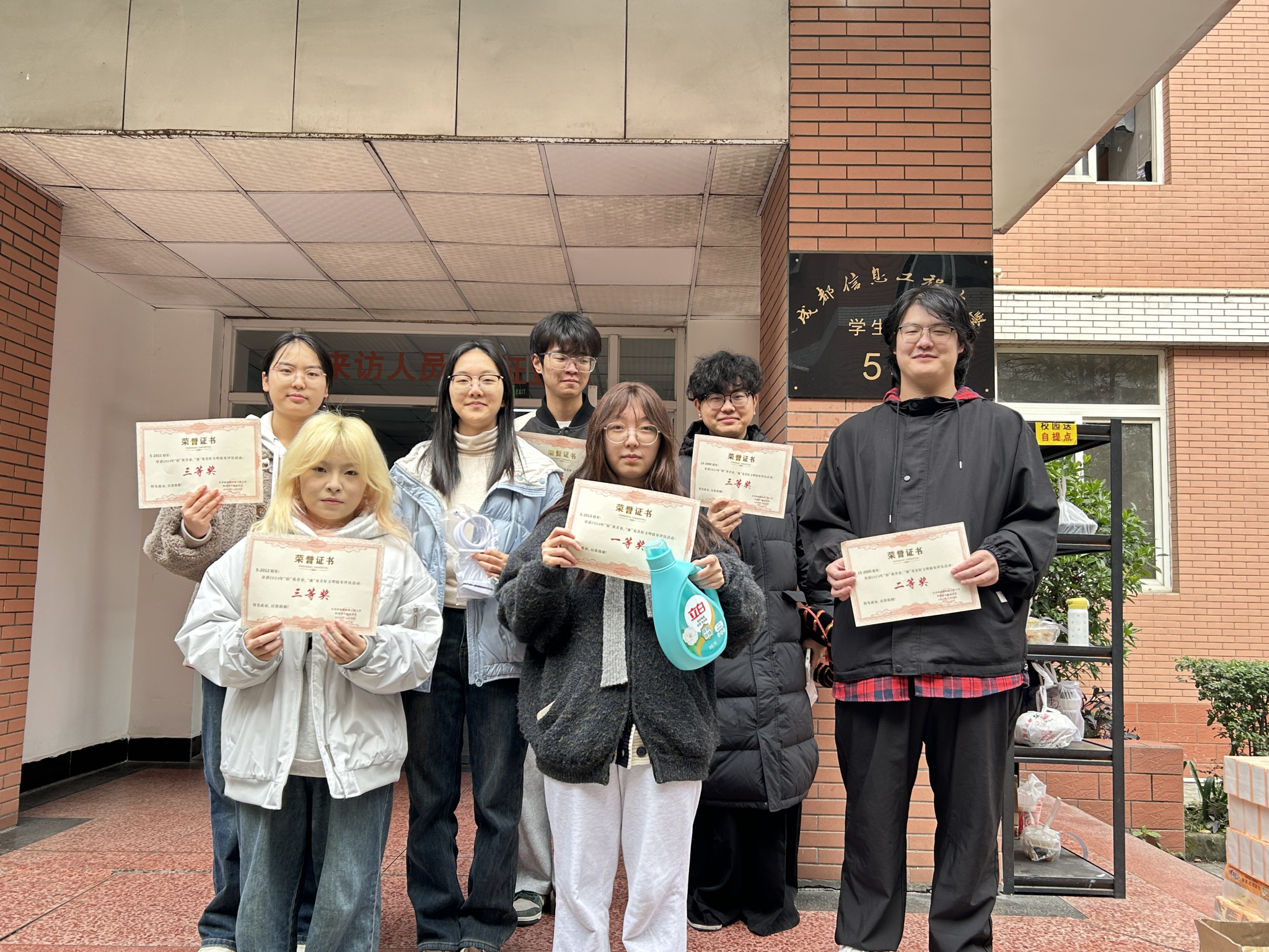 11月29日12:20,获奖寝室在5栋门前进行拍照、颁发奖状、奖品、留影。