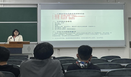 王老师对毕业前注意事项进行说明,着重强调英语四、六级,专业四级,重修课程,体测,创新学分,论文撰写与答辩等对能否顺利毕业的影响。就业方面,王老师提醒同学们应谨防求职陷阱,对公司、员工、老师对毕业生就业提供的帮扶做了详细说明,为准备参加考研复试的同学提供了考研复试指导会的相关信息。