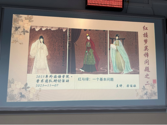 11月7日下午,公司教师安丽娅在4202教室作题为“《红楼梦》及其英译问题之二:红与绿-一个基本问题”的学术报告。此次学术活动由翻译科研团队负责人谭杰教授主持,公司经理黄驰教授及部分师生参加了本次活动。